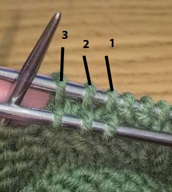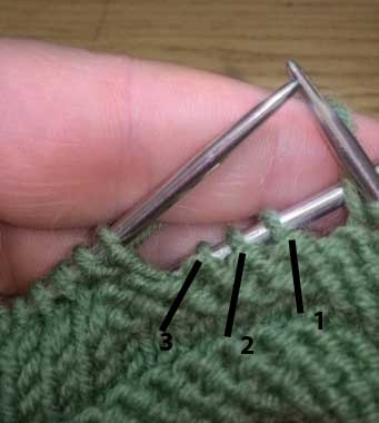 Прибавить 3 петли : снять 3 петли на доп. спицу и оставить за работой, из протяжек нижнего ряда этих петель вывязать 3 новые петли, затем петли с доп. спицы провязать лицевыми.