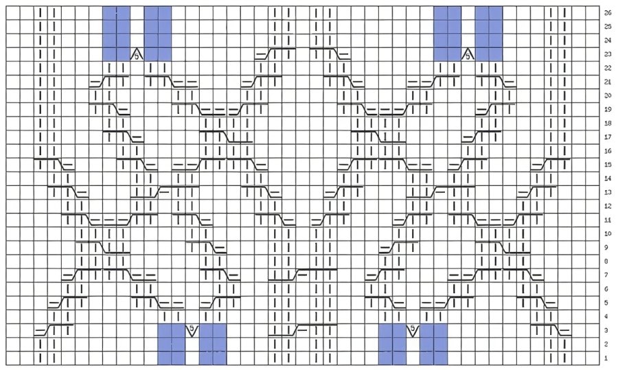 Ширина мотива 31 петля, в высоту повторяем 1 раз с 1-го по 26 ряд, затем с 3-го по 26-й ряд.